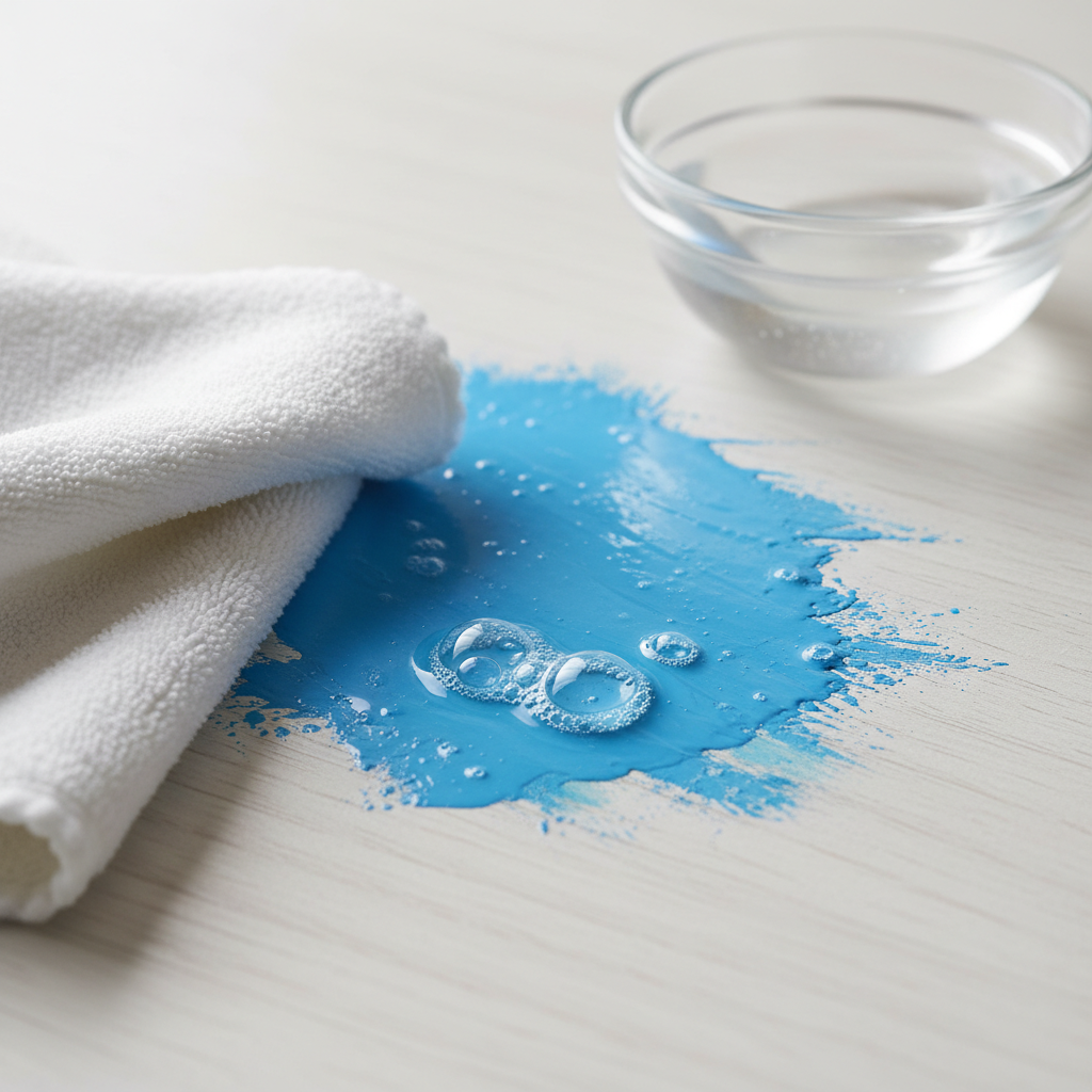 Voordat we de diepte in duiken met opgedroogde vlekken, is de allerbelangrijkste tip: wees er snel bij. Zodra je morst, pak je een vochtige doek of keukenpapier en dep je de verf weg. Werk van buiten naar binnen om de vlek niet groter te maken. Gebruik vervolgens een schone doek met wat water en milde zeep (zoals groene zeep of afwasmiddel) om de restjes te verwijderen. In negen van de tien gevallen is dit voldoende om de ramp te keren.